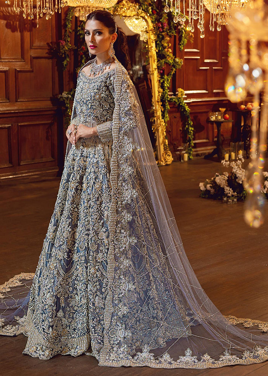A poetic rendition of bridal bliss and layers of ethereal romance curated in shades of azure blue. A magical vibe with fading lights through gleaming chandeliers. Hazy colors with sparks of silver and glitz, the lady stands tall as an epitome of timelessness and valor. A net lehnga choli sprawled with hand embellishments in classic floral patterns, completed with an elaborate bridal dupatta.