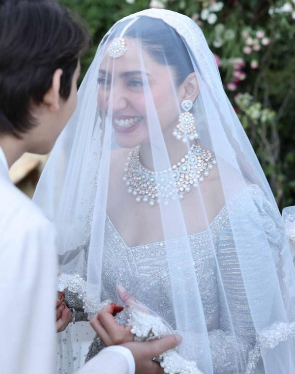 An alluring shade of pink is used as a canvas for a knee length kameez and sharara set. This feminine silhouette is ornamented with pearls, naqshi and dabka. Paired with an embroidered sharara and dupatta, the set is a staple for this season’s traditional affairs.