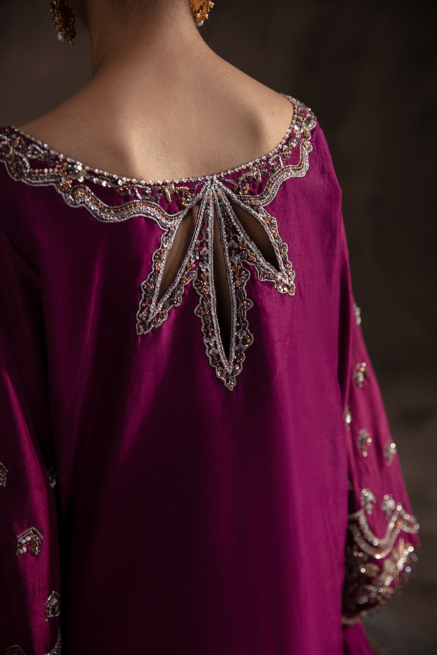 A classic burgundy shalwar kameez featuring wide opensleeves adds a touch of regal charm, while intricate floral trellises adorn the kameez front and back, shimmering with handcrafted gold, copper, and silver tone embellishments. Each stitch, delicately woven with cora, tilla, and dabka, tells a story of exquisite craftsmanship. To complete the look dyed organza dupatta comes along.