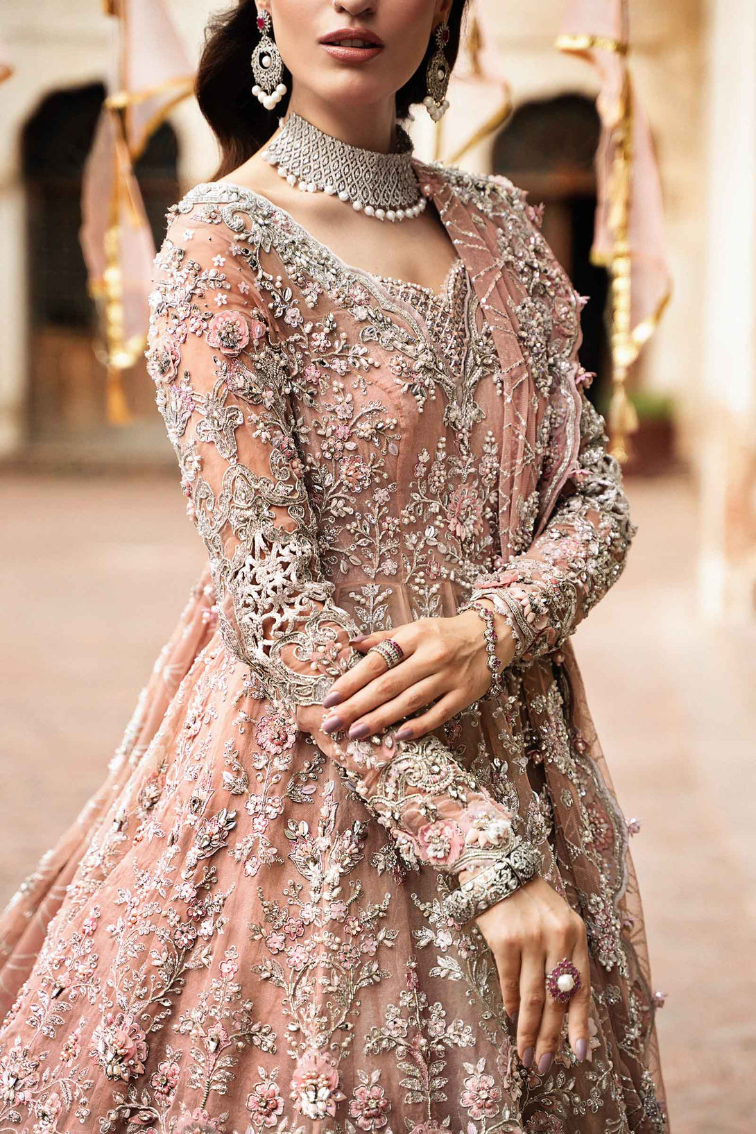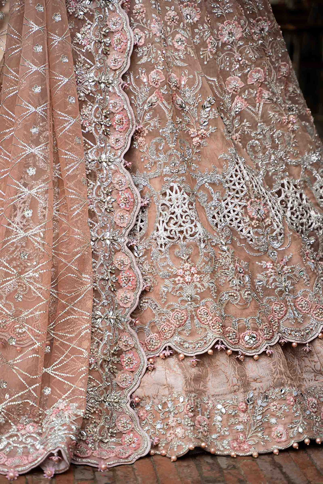 'Diyora' is a poetic symphony of meticulous craftsmanship - Weaving timeless allure with ethereal 3D floral work from expressions of glistening stones, crystals, pearls & cut dana that embody a living poem of grace. Designed in French patterns, this masterpiece is perfect to grace nikah & walima look.