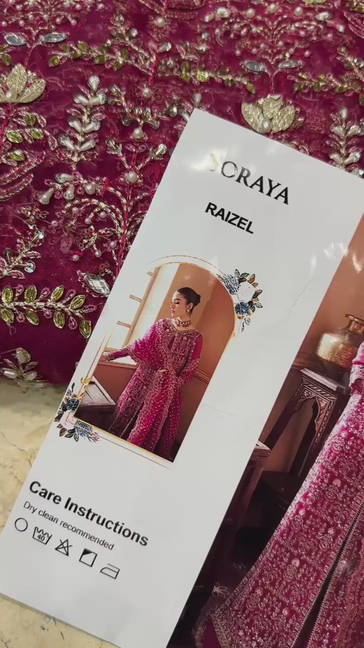 Emerges as a beacon of elegance, donning a Ravishing Dark Fuchsia gown in Organza, meticulously paired with Raw Silk, Sharara, reflects the masterpiece of hand crafted artistry. A divine touch is introduced through a delicate and rich Zari Oraganza Dupatta with motifs on the corner and sequence spray dance in jubilant harmony. Raizel’s presence will make you the center of attention, worthy of admiration and awe.